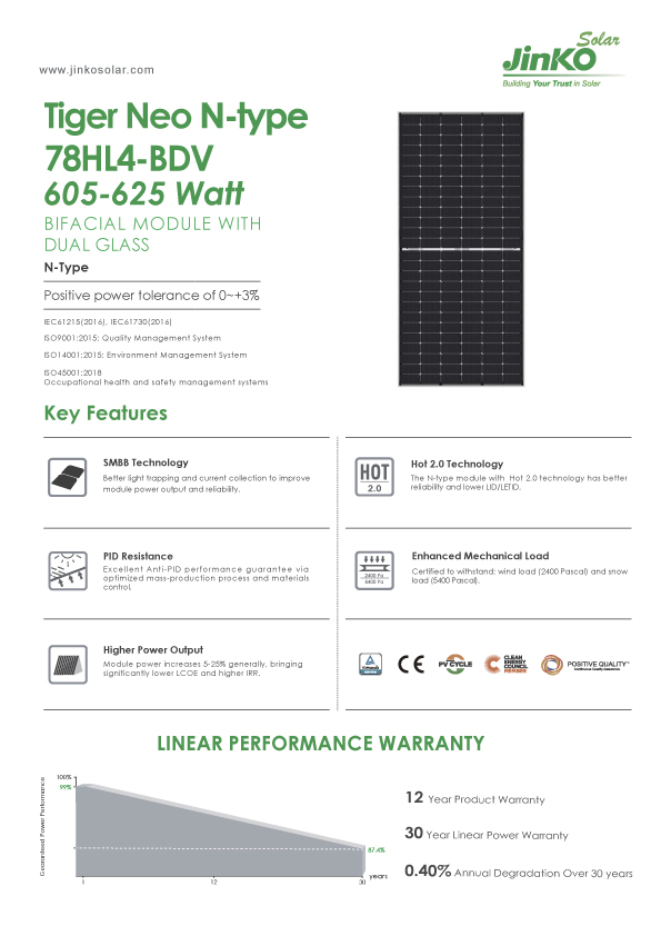 Tấm pin năng lượng mặt trời 610W - Jinko Tiger Neo là một sản phẩm cao cấp của Jinko Solar, đem đến nhiều tính năng nổi bật và cải tiến tiêu biểu. Được thiết kế với công nghệ 2 mặt kính tiên tiến, sản phẩm này không chỉ tối ưu hóa sự hấp thụ ánh sáng mặt trời mà còn cải thiện khả năng tạo điện ở cả hai mặt. Sản phẩm không chỉ cạnh tranh mạnh mẽ với các đối thủ hàng đầu trên thị trường mà còn tập trung vào tuổi thọ và độ bền, giúp chúng hoạt động ổn định trong môi trường khắc nghiệt.
